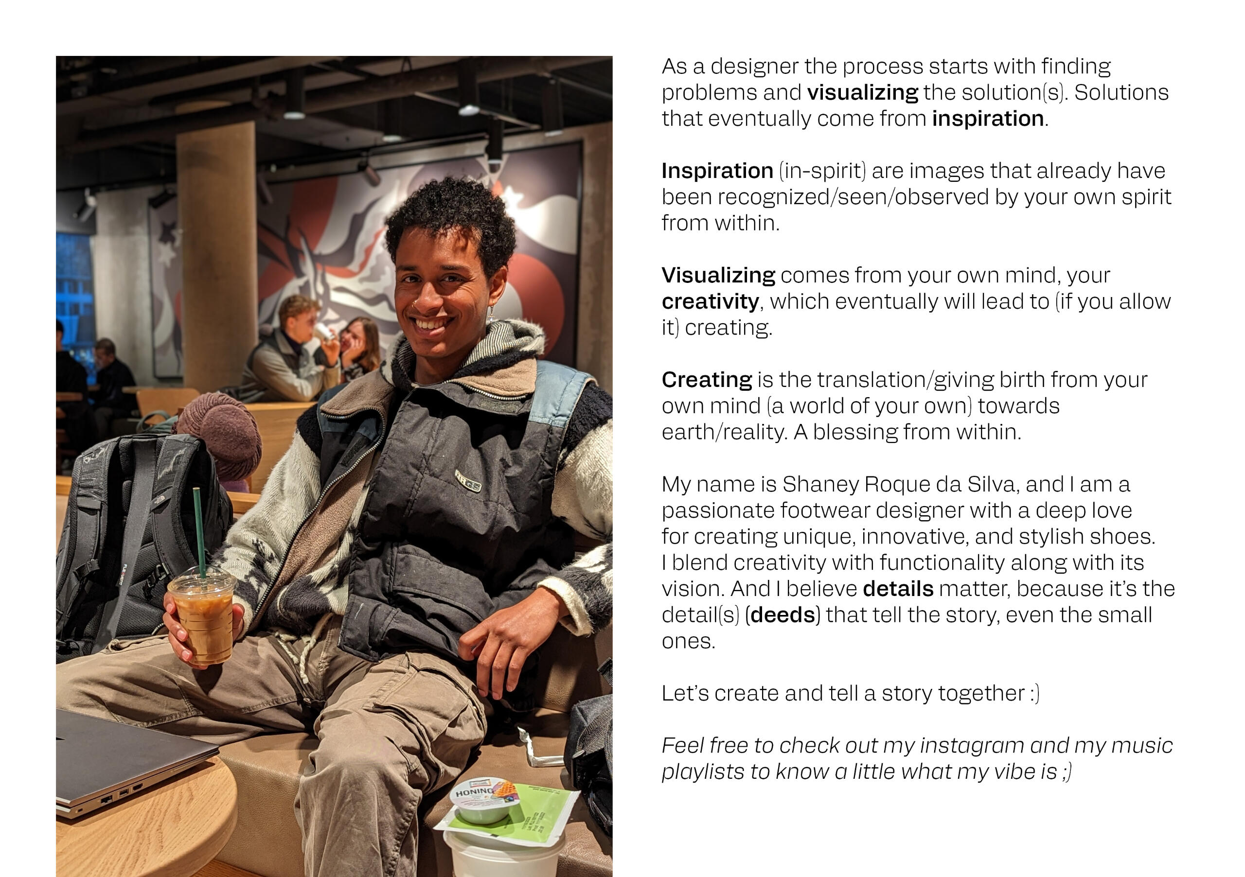 As a designer the process starts with finding problems and visualizing the solution(s). Solutions that eventually come from inspiration.Inspiration (in-spirit) are images that already have been recognized/seen/observed by your own spirit from within.Visualizing comes from your own mind, your creativity, which eventually will lead to (if you allow it) creating.Creating is the translation/giving birth from your own mind (a world of your own) towards earth/reality. A blessing from within.My name is Shaney Roque da Silva, and I am a passionate footwear designer with a deep love for creating unique, innovative, and stylish shoes. I blend creativity with functionality along with its vision. And I believe details matter, because it's the detail(s) (deeds) that tell the story, even the small ones.Let's create and tell a story together :)Feel free to check out my instagram and my music playlists to know a little what my vibe is ;)